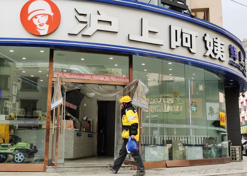 5月8日,内蒙古呼和浩特市,外卖员进入“沪上阿姨”门店内取饮品。当日,“沪上阿姨”正式登陆香港交易所。(图片来源:中新社)