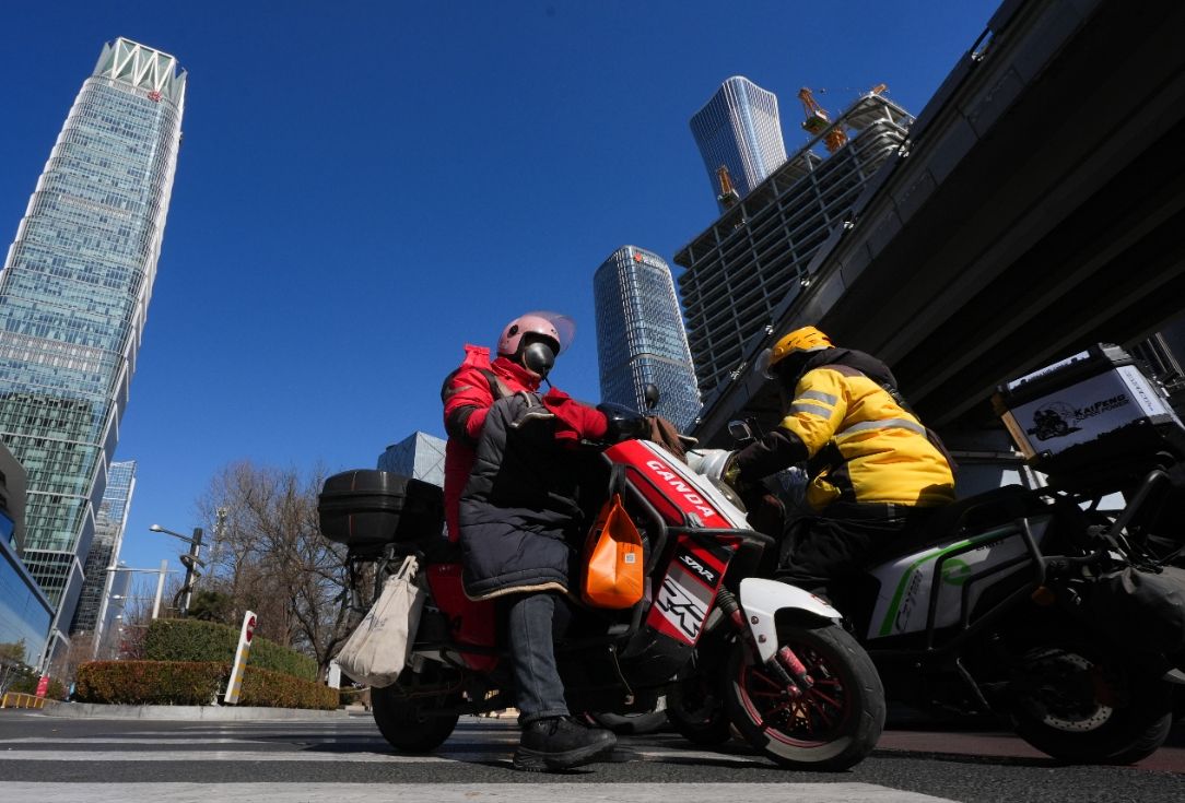 2月20日,外卖骑手在北京国贸送餐。(图片来源:中新社)