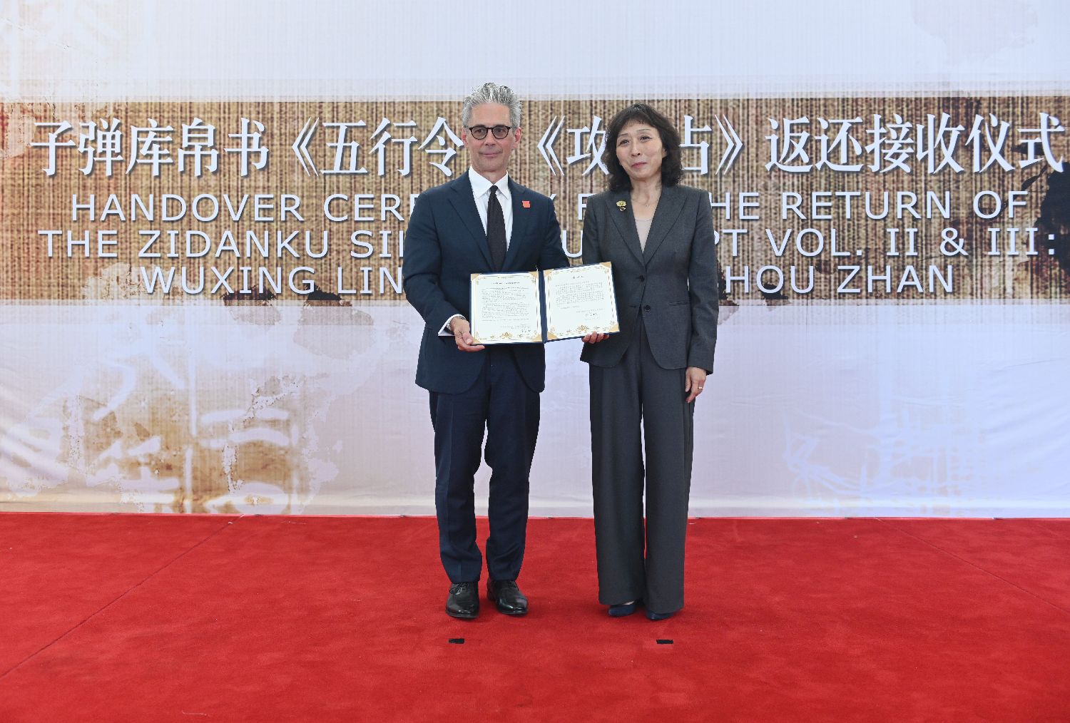 当地时间5月16日,华盛顿,中国国家文物局在中国驻美大使馆接收美国史密森学会国立亚洲艺术博物馆返还的子弹库帛书《五行令》《攻守占》。(图片来源:中新社)