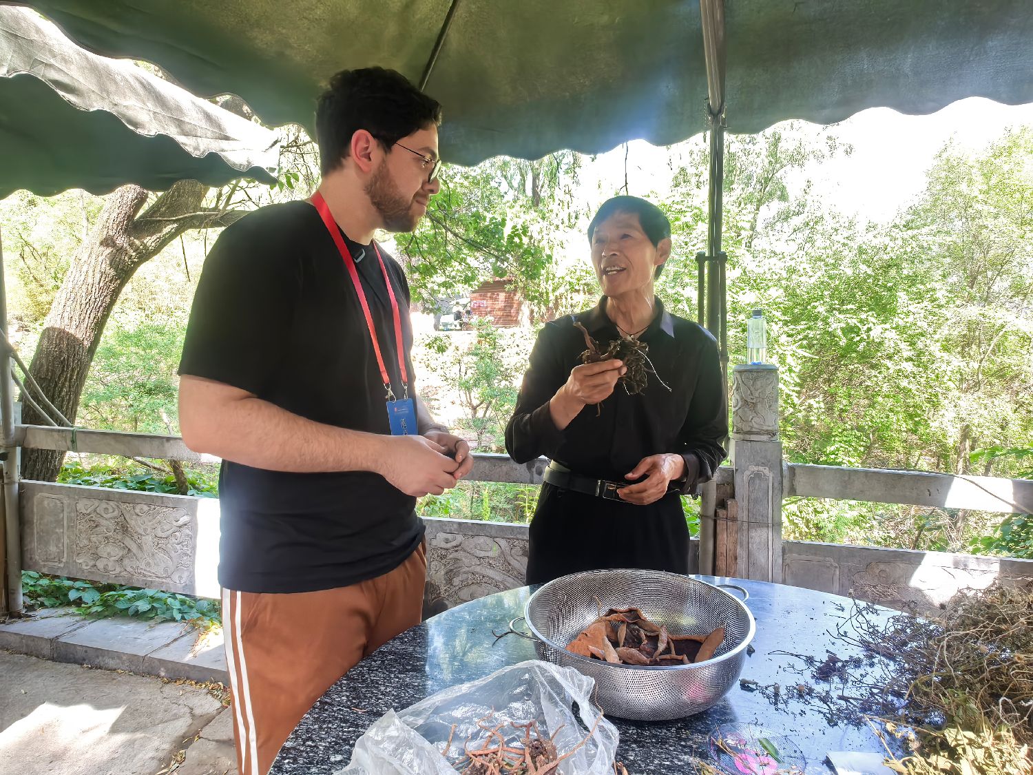 5月19日,河南新乡,摩洛哥籍留学生睿龙向药农请教中药材知识。(图片来源:中新社)