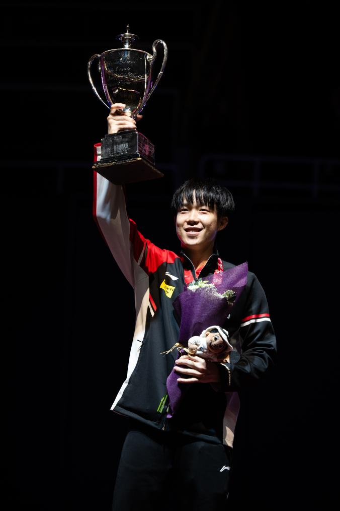 中国选手王楚钦在颁奖仪式上高举奖杯。(图片来源:新华社)