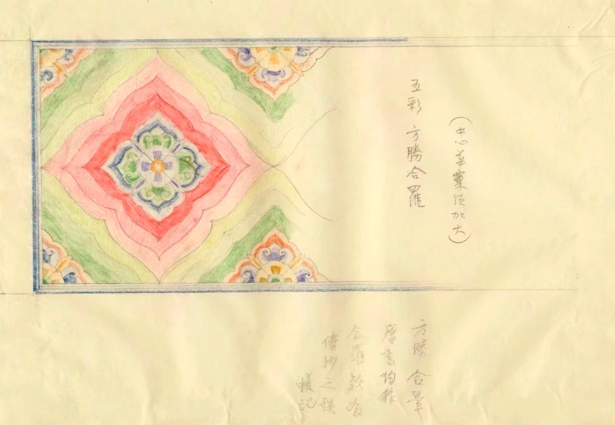 5月27日,“彩画千年——中国官式彩画传承与创新展”在故宫博物院永寿宫展厅正式对公众开放。图为梁思成手绘的宋代五彩方胜合罗(复制品)。(图片来源:中新社/故宫博物院供图)