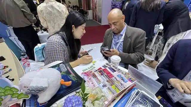 在上海国际旅游交易博览会上交谈的展商。(图片来源:《湖北日报》)