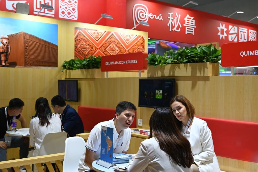 参展商27日在秘鲁展台与观众洽谈。(图片来源:新华社)