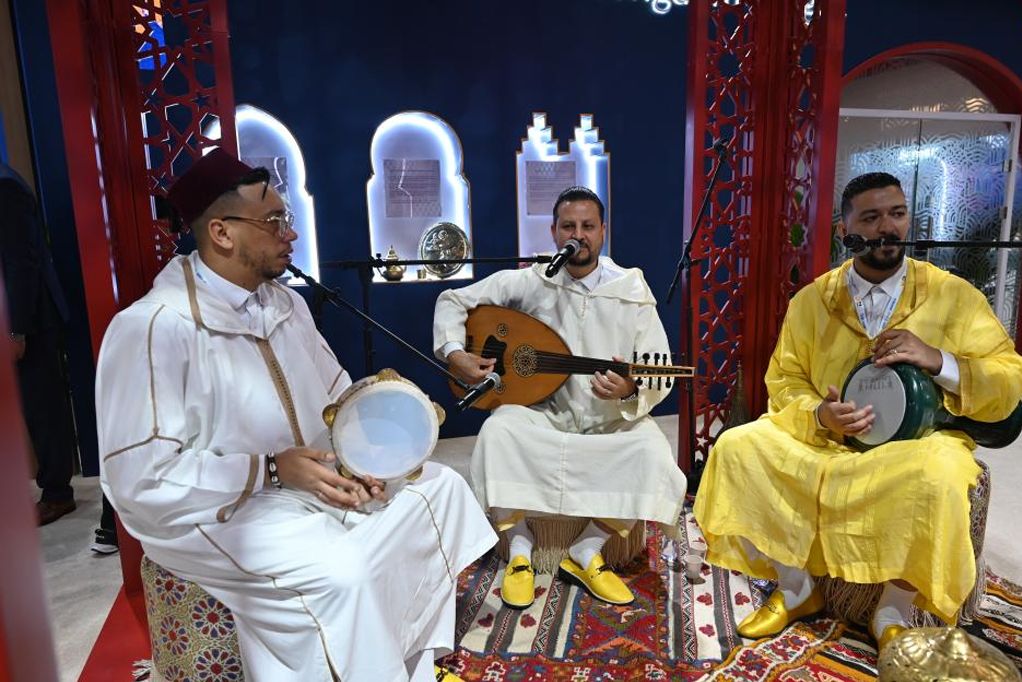 参展工作人员27日在摩洛哥展台为观众演奏音乐。(图片来源:新华社)