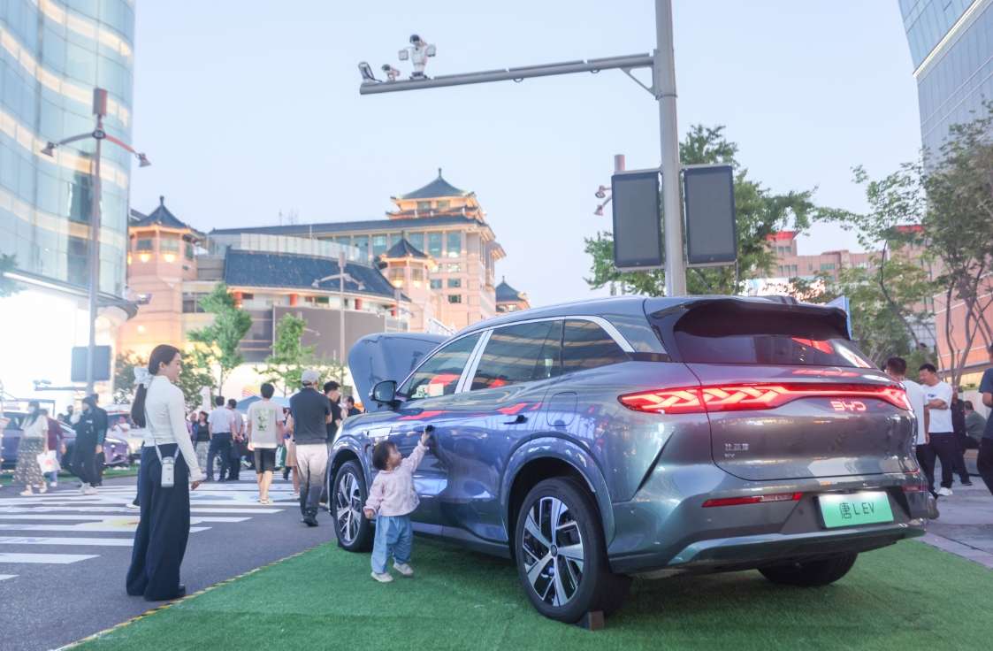 5月15日,北京王府井步行街,游客参观比亚迪唐L电动汽车。(图片来源:中新社)