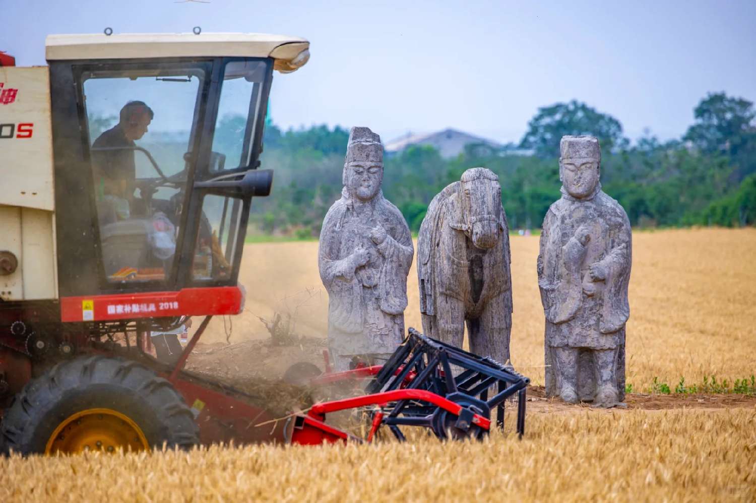 每年麦收季,陵区麦田会采用收割机进行机械作业,工作人员引导农机手避让石像。针对石刻周围的作物,工作人员都会对其进行人工收割,更稳妥地保护文物。