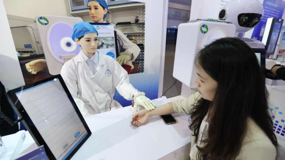 5月8日,第二十七届中国北京国际科技产业博览会在国家会议中心开幕。图为中医四诊AI机器人亮相科博会。(图片来源:中新社)