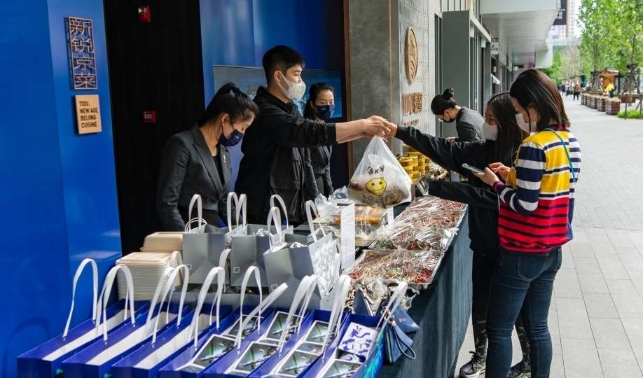 北京市朝阳区望京街道的一家餐饮店,在店铺门口为顾客提供餐食自提外卖服务。(图片来源:中新社资料图)