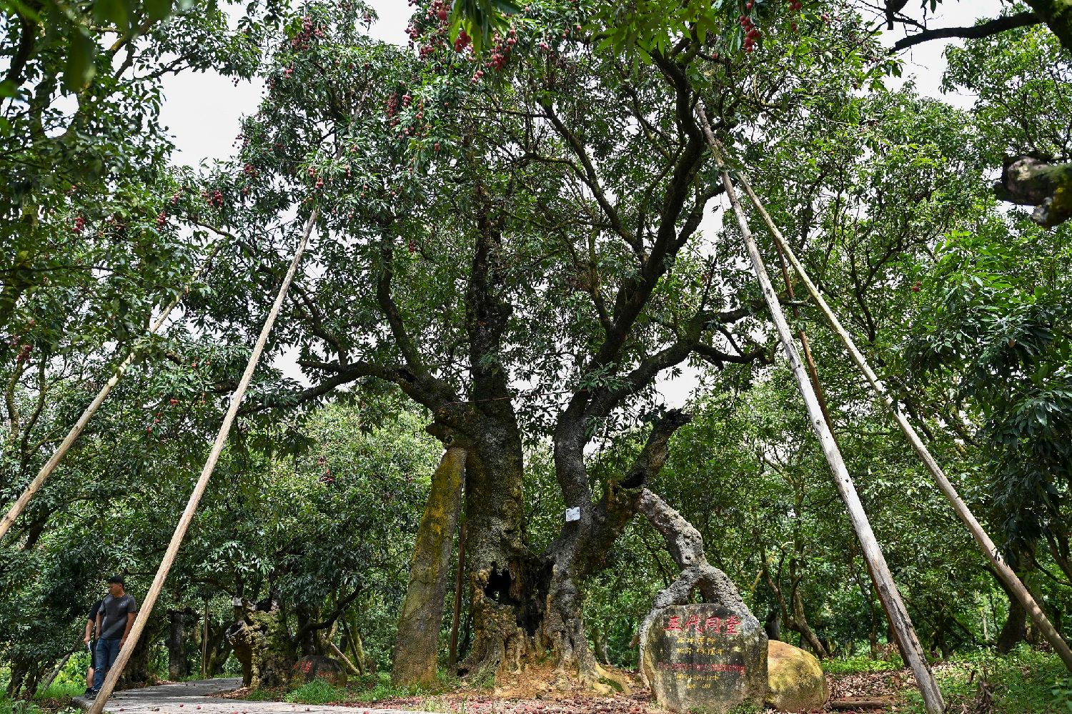 中新社22日报道,根子镇贡园建成于隋唐年间,是目前中国面积最大、历史最悠久、保存最完好的古荔园之一。贡园占地面积80亩,500年以上树龄的古荔枝树有39棵,其中9棵树龄超过1300年,品种主要为黑叶、妃子笑、白糖罂等。