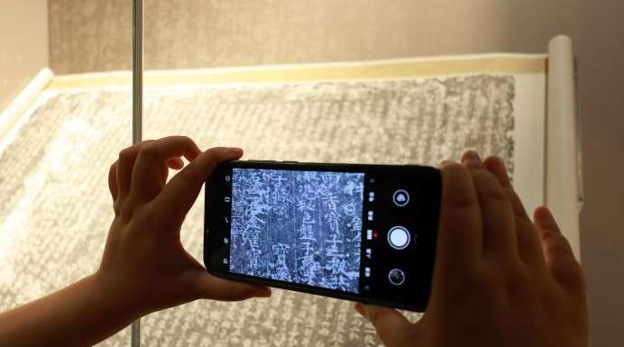 6月24日,游客拍摄《衣物帐》碑拓本上的“秘色”两字。(图片来源:中新网)