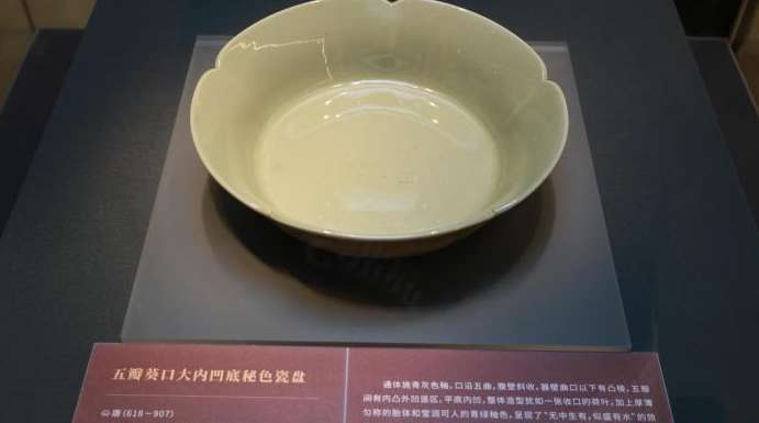 “这件法门寺出土的五瓣葵口大内凹底秘色瓷盘,盘口沿作五曲莲瓣、斜腹,由于釉层均匀,造型独特,在灯光的照射下,呈现了‘无中生有、似盛有水’的效果。”张晓娟表示,此次展出的大唐秘色瓷跨越千年后再次回家“省亲”弥足珍贵。
