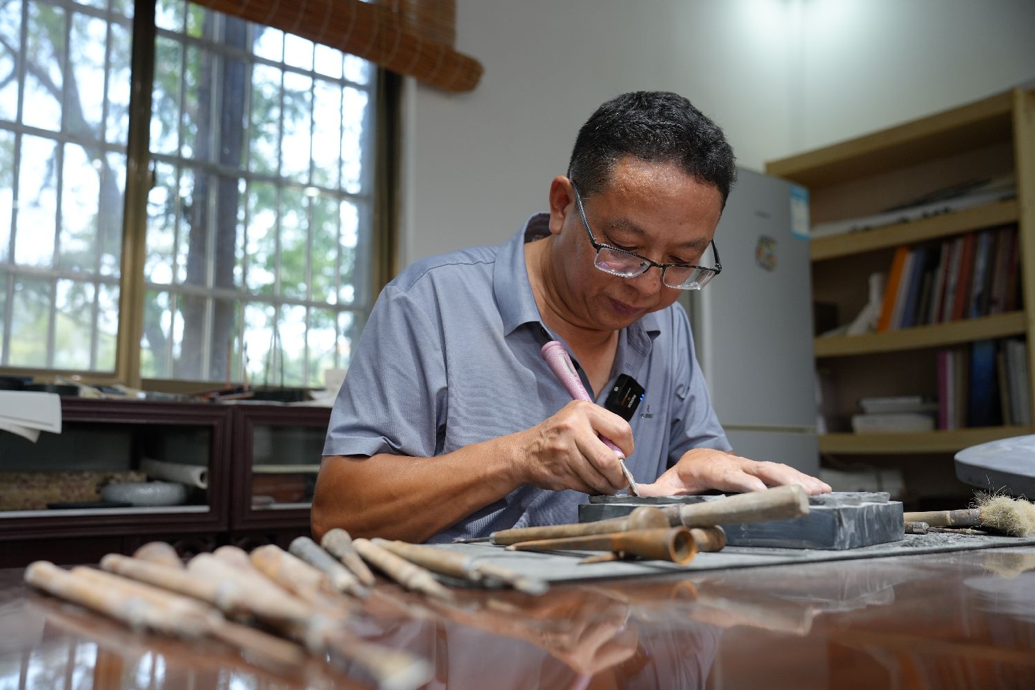 7月12日,江西庐山秀峰景区一侧的金星砚文化博物馆内,李平寒在金星砚石头上雕刻图案。(图片来源:中新社)