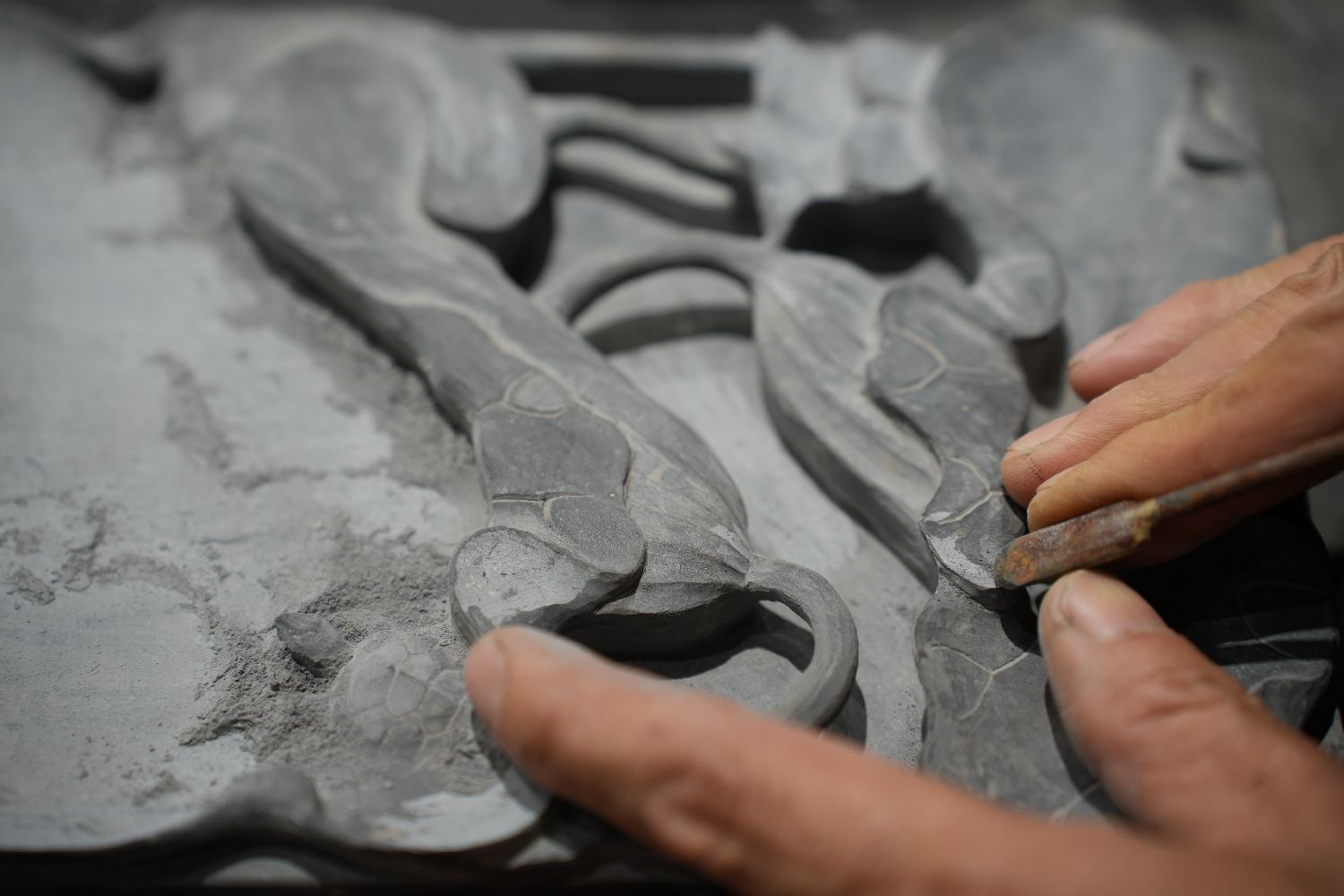 其灰白陈旧的工作台上,李平寒将坯料固定于砚凳,打磨坯砚,依形制大小细细地磨制出墨池,再至一侧顺势凿刻山水、人物、鸟兽、树木等,一旁的金星处,刻上涟漪波纹,几许清雅之气便扑面而来。