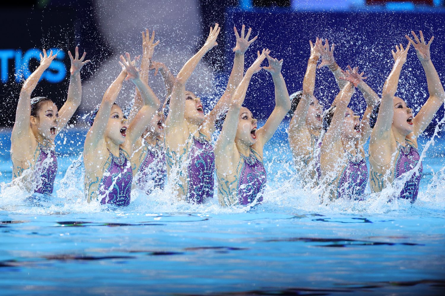 7月20日,2025年新加坡游泳世锦赛花样游泳集体自由自选决赛上演,中国队夺得冠军。图为中国队在比赛中。(图片来源:中新社)