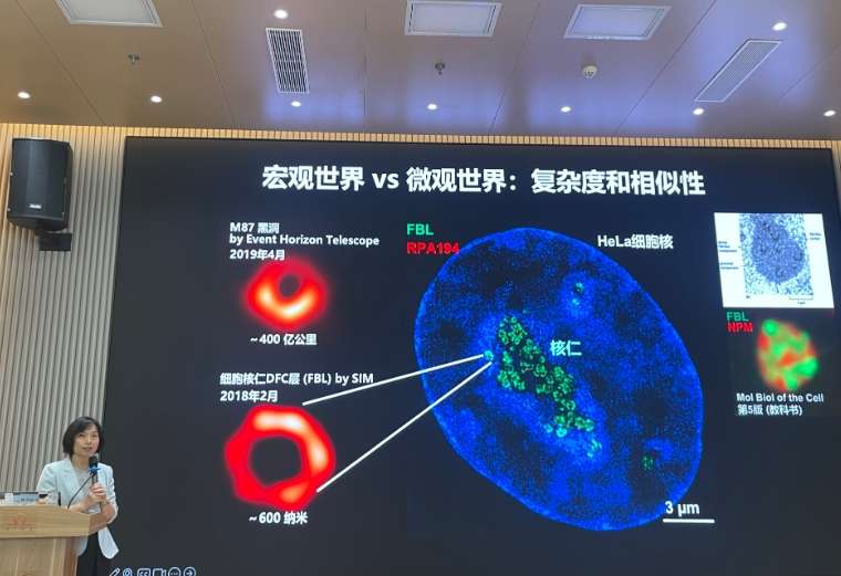 中新社报道,她在现场展示了一组照片,一张是事件视界望远镜(EHT)于2019年4月发布的人类首张黑洞照片——M87黑洞,该黑洞事件视界直径约为400亿公里;另一张是2018年2月,陈玲玲团队拍摄到的细胞核仁DFC(致密纤维组分)层图像,其直径约为600纳米。