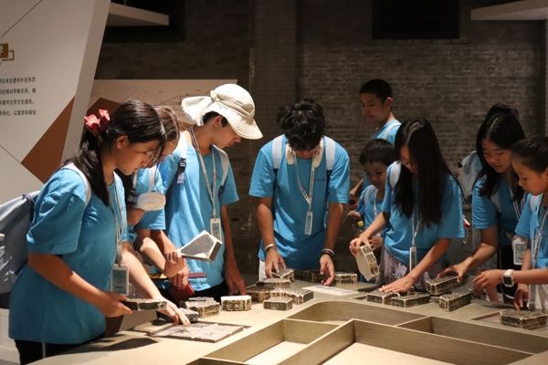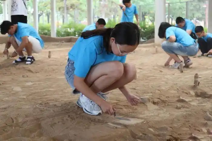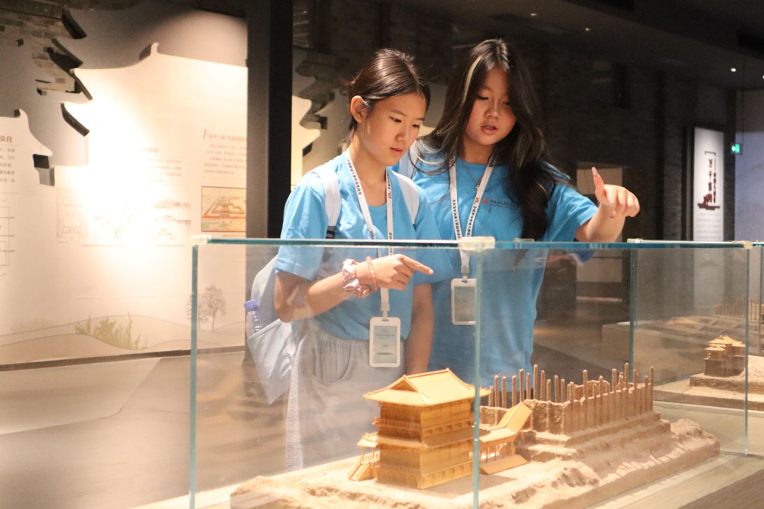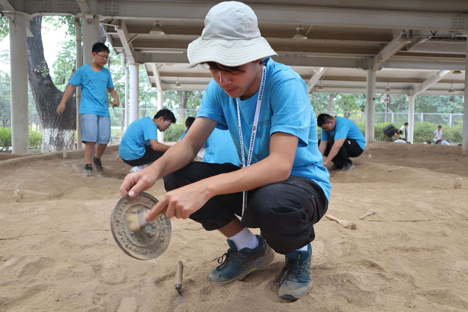 参加第八届全球华语朗诵大赛陕西集结营的华裔青少年24日到访陕西西安大明宫国家遗址公园,学习考古知识,体验模拟考古。
