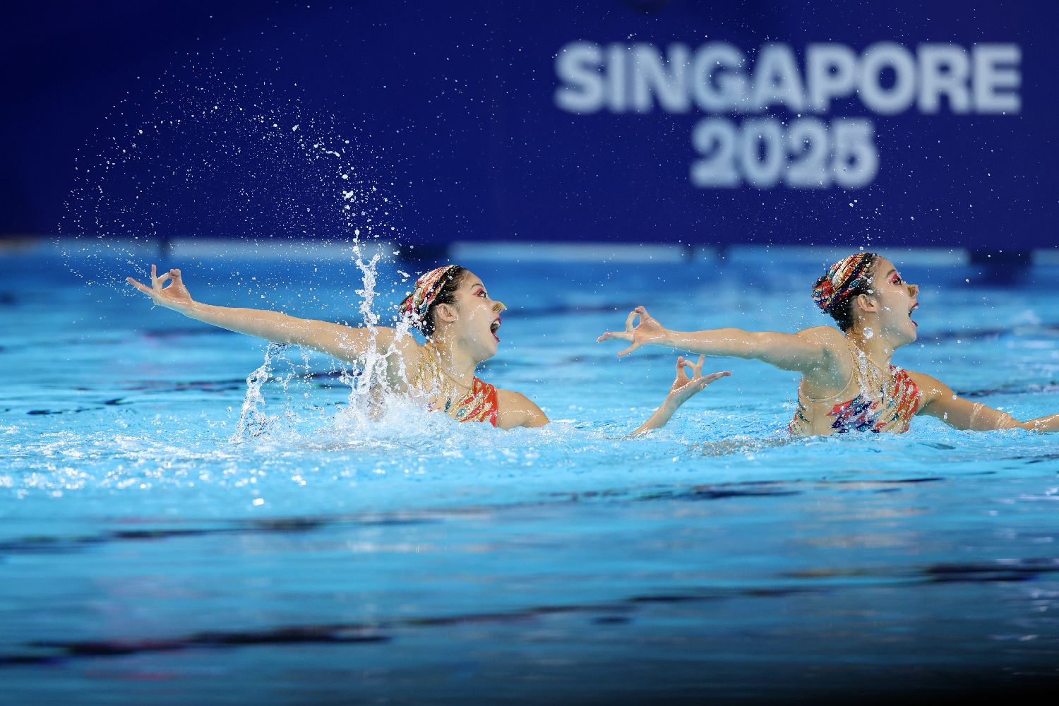 7月24日,在新加坡举行的2025年世界游泳锦标赛花样游泳女子双人自由自选决赛中,中国组合林彦含/林彦君以274.3090分获得第四名。(图片来源:中新社)