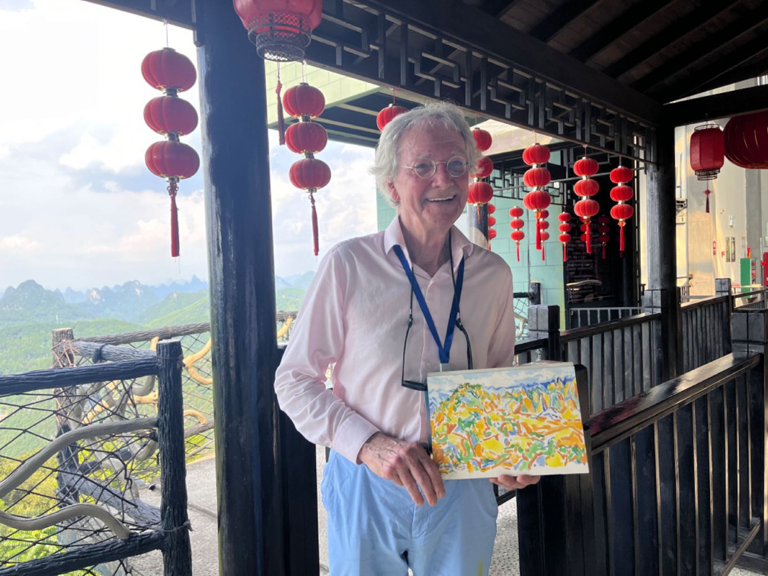 “我已经在脑海里寻找桂林很久了!”北京时间7月26日下午,澳大利亚水彩画协会主席、画家大卫·范·纽恩站在广西桂林市阳朔县如意峰上,迫不及待地勾勒出一幅速写。