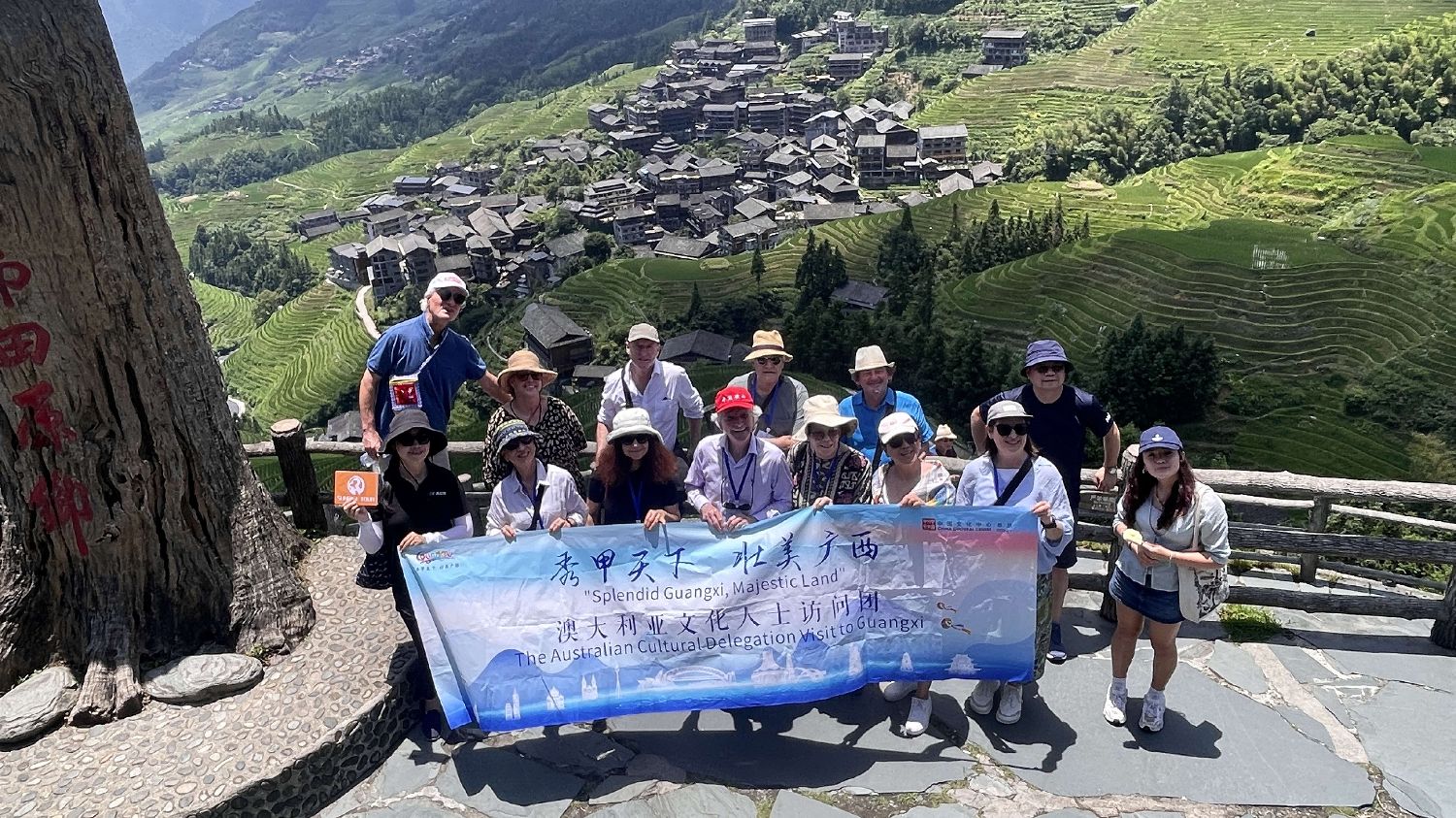 中新社报道,7月25日,“秀甲天下壮美广西”澳大利亚文化人士访问团一行11人抵达广西桂林。他们在三日内先后探访广西桂海碑林博物馆、象鼻山与两江四湖,在阳朔乘竹筏漂流遇龙河,登临如意峰,又赴龙胜各族自治县龙脊梯田饱览梯田美景,在山水画卷中汲取创作灵感。