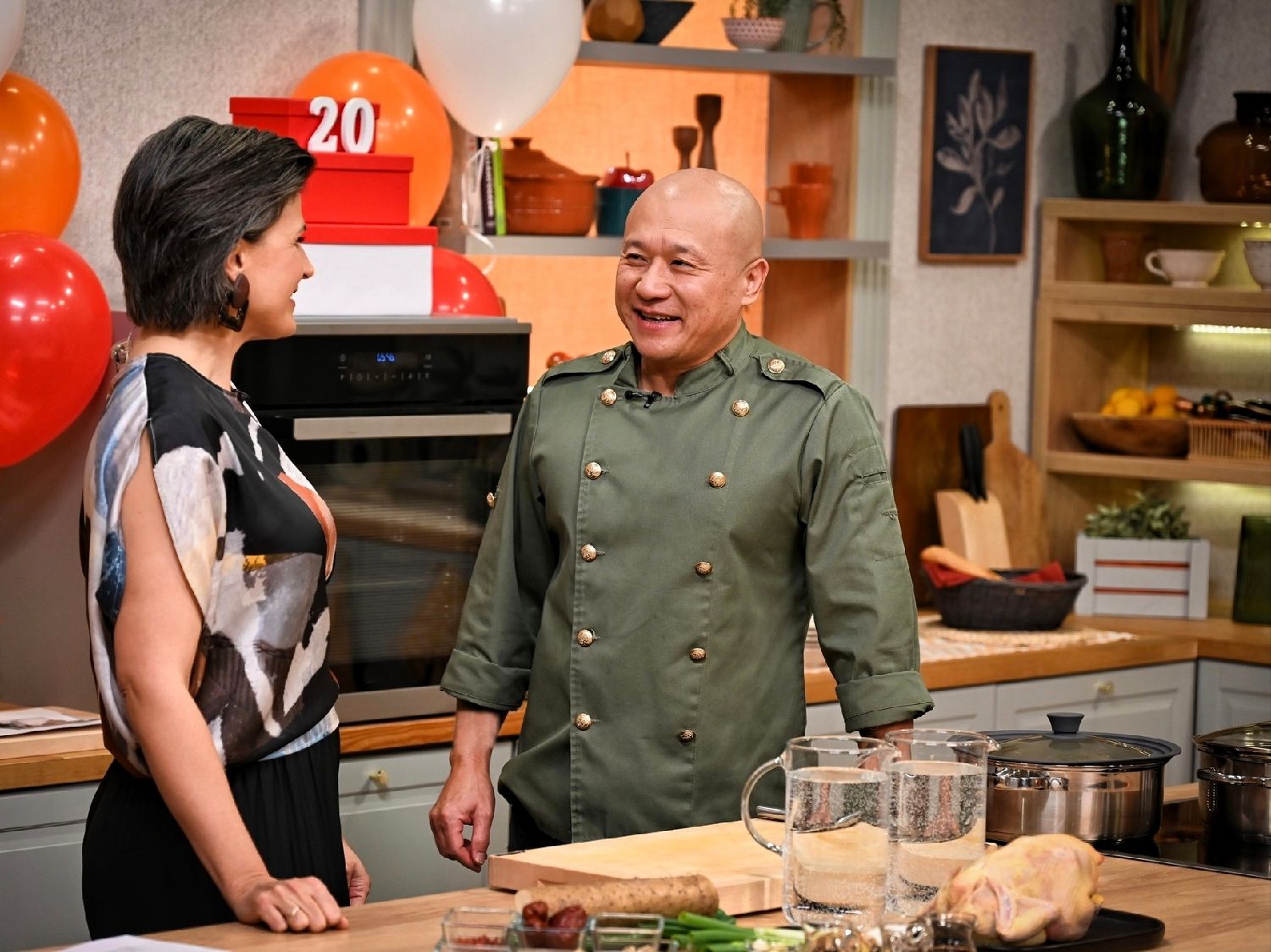 2024年11月,王强(右)受邀在匈牙利一家电视台的美食节目上制作中餐。(图片来源:中新社/受访者供图)