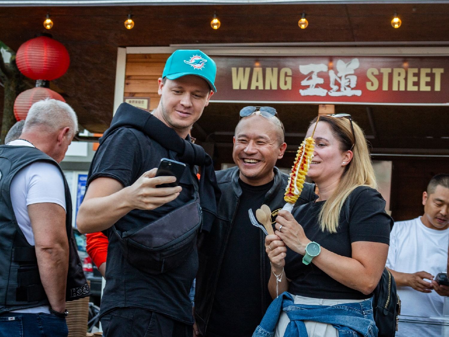 2024年8月,王强的餐厅在布达佩斯二区千禧公园举行的“匈牙利美食节”上摆摊卖小吃,图为王强与当地食客合影。(图片来源:中新社/受访者供图)