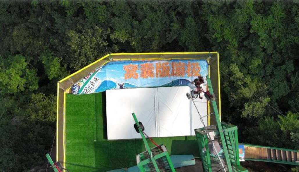 一般的蹦极通常至少要60米高,但目前市面上的“窝囊版”蹦极主要有20米和30米两种高度。从业者表示:“从二三十米高度下,正常下坠落地只要三四秒,但‘窝囊版’蹦极落地要15秒左右,关键在于游玩者一跳,缓降器就会启动。”