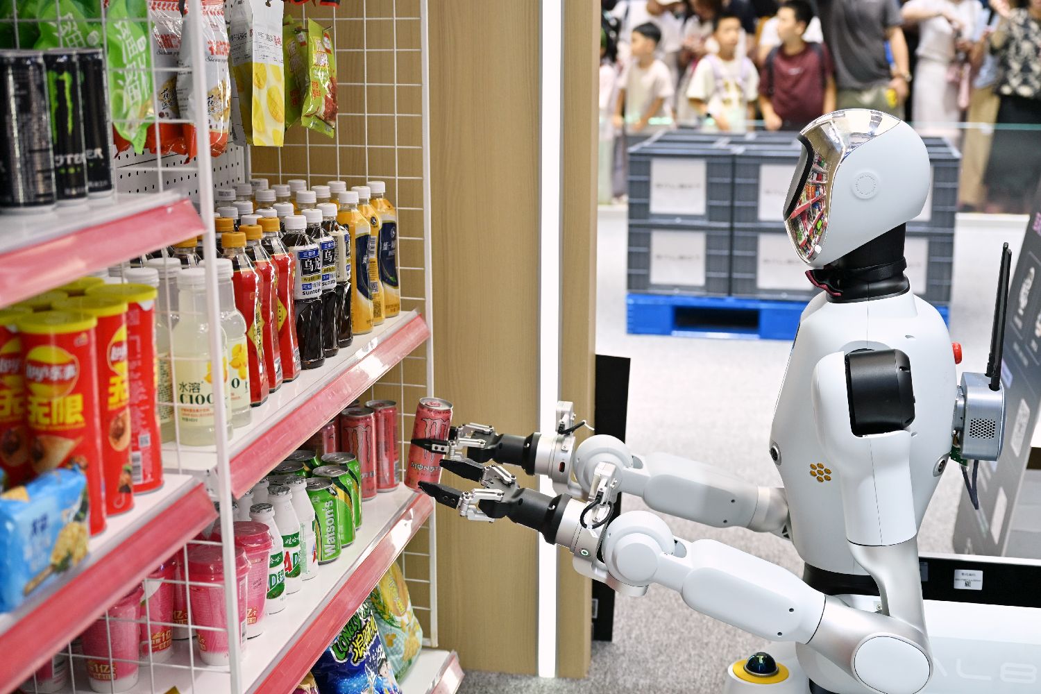 8月10日,世界机器人大会人气旺。图为在零售场景工作的人形机器人。(图片来源:中新社)