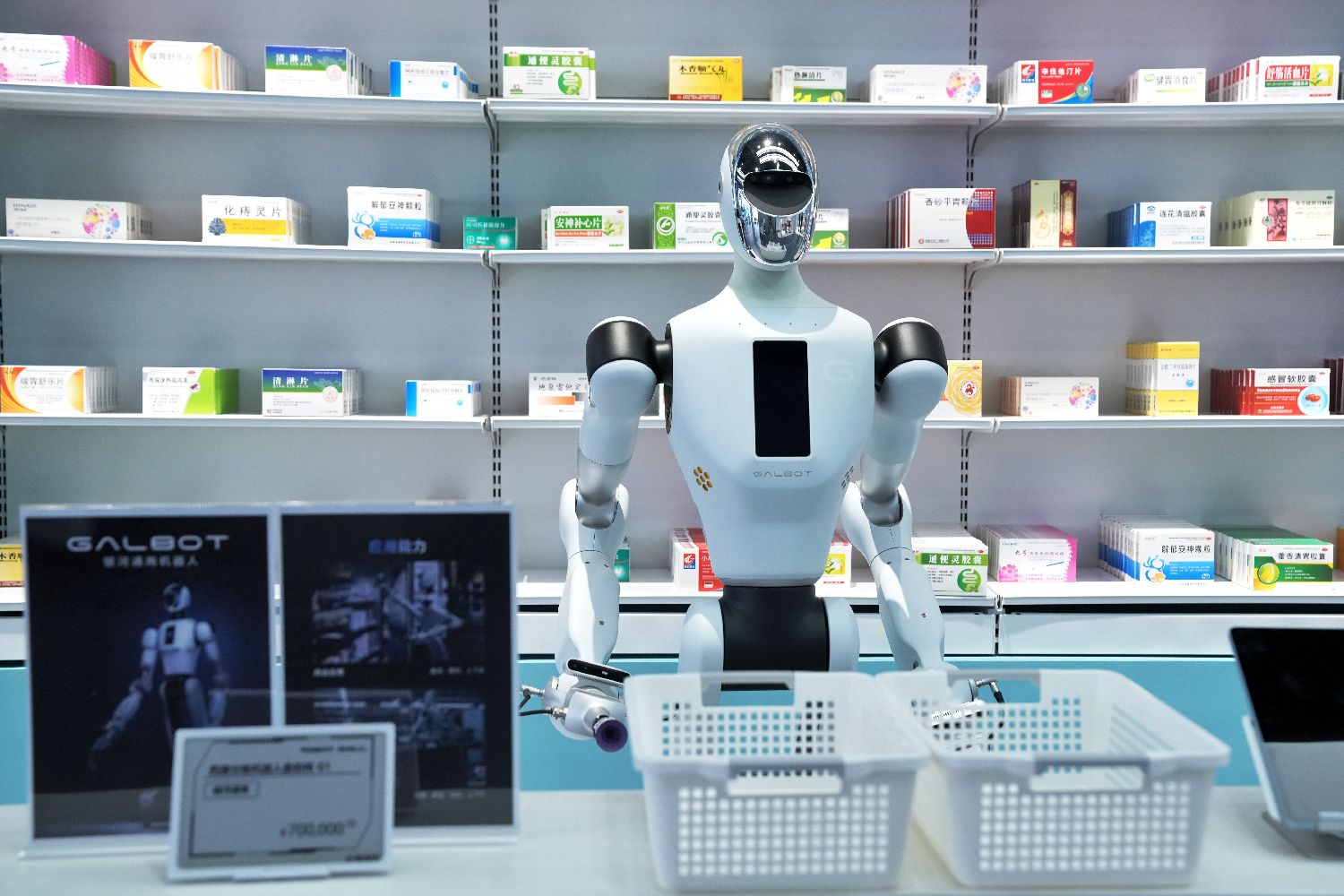 8月4日,在位于北京亦庄的全球首家具身智能机器人4S店Robot Mall拍摄的药品分拣机器人。(图片来源:中新社)
