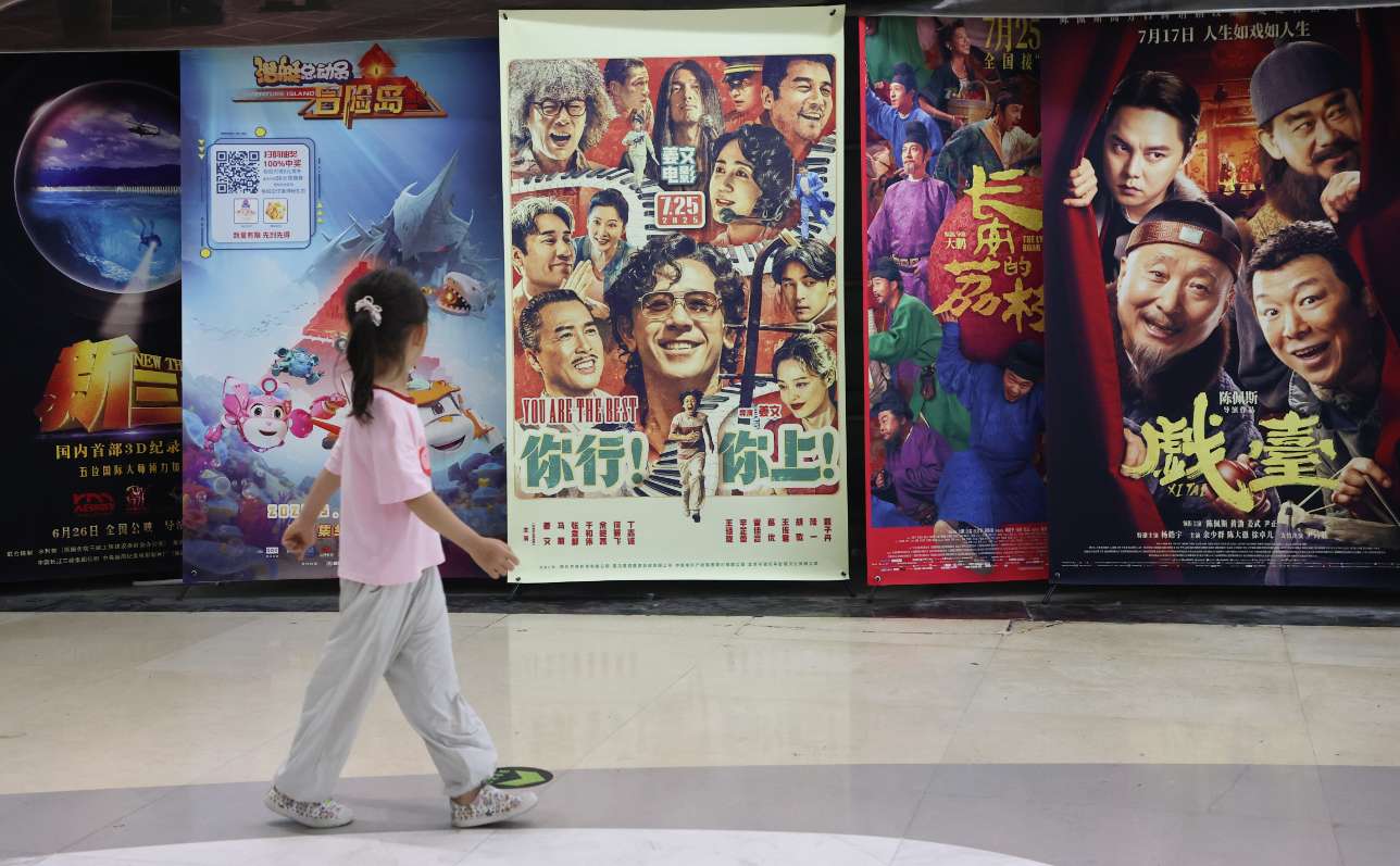 8月1日,北京,小朋友从电影院展出的海报前经过。(图片来源:中新社)