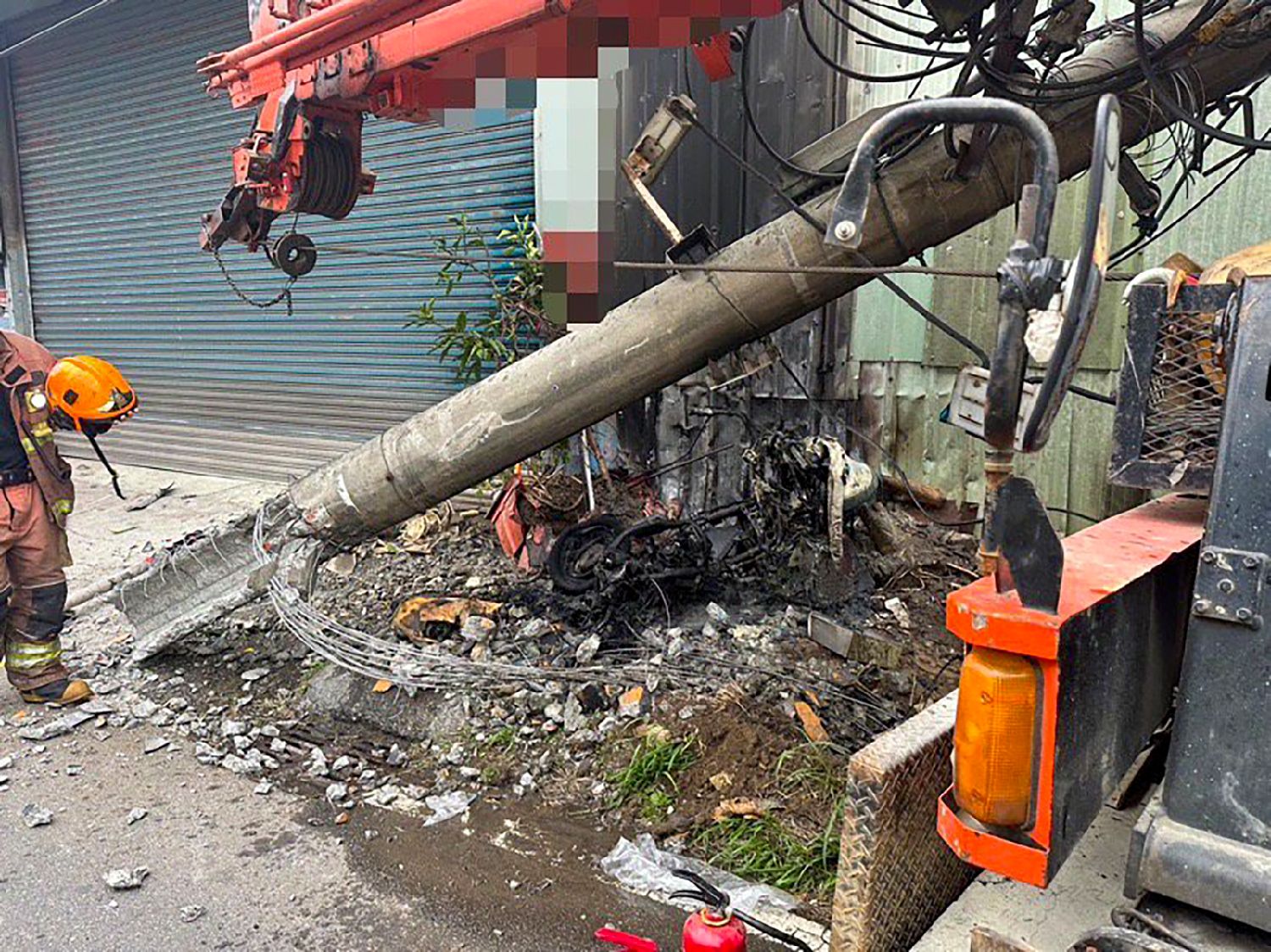 2023年12月23日台湾新北市五股区民义路二段发生一起大型吊车撞倒路旁电线杆事故,吊车撞击电线杆瞬间溅出火花引燃临停一辆机车起火燃烧。事故导致部分住户停电。(图片来源:香港中通社资料图)