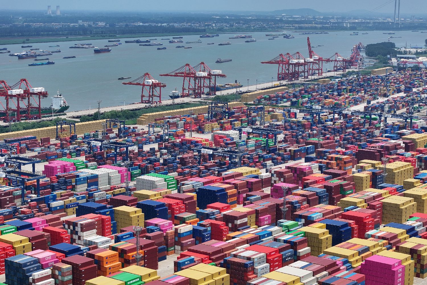 图为7月14日航拍的江苏南京龙潭港进出口集装箱码头繁忙景象。(图片来源:中新社)