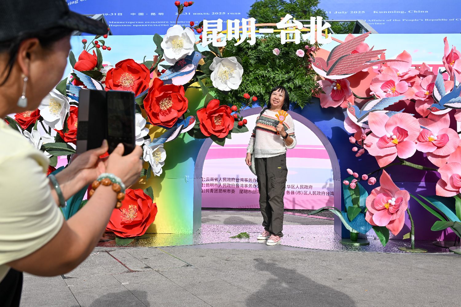 正值中国传统节日七夕节即将来临之际,活动现场一个由山茶花、蝴蝶兰搭建的“虹桥鹊渡·同心相会”花桥装置,吸引众多市民游客拍照打卡。