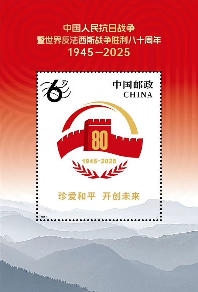 《中国人民抗日战争暨世界反法西斯战争胜利八十周年》纪念邮票小型张1枚。(图片来源:中新社/中国邮政供图)