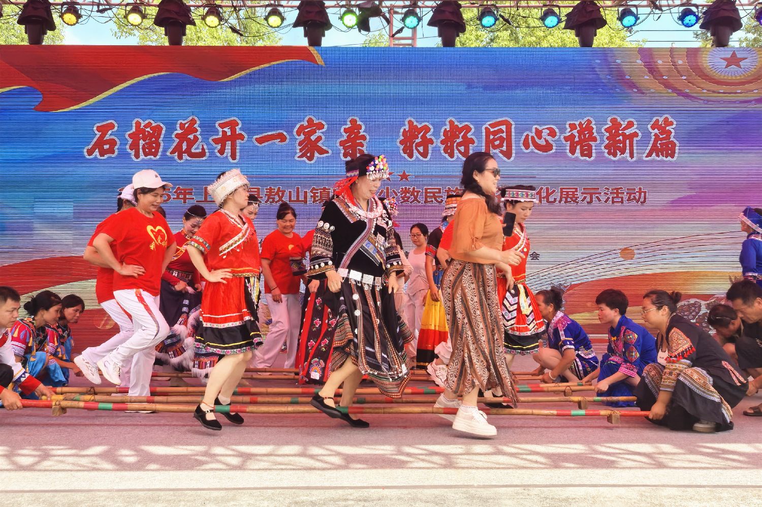 三对竹竿在地面上铿锵开合,村民们在竹竿分合的瞬间轻盈穿梭,不少游客加入体验。“竹竿舞看着简单,跳起来才知道要配合默契。”在村民的引领下,前来游玩的巴基斯坦留学生伊姆桑·沙皮(Imsan Shapi)尝试数次才跳出竹阵。