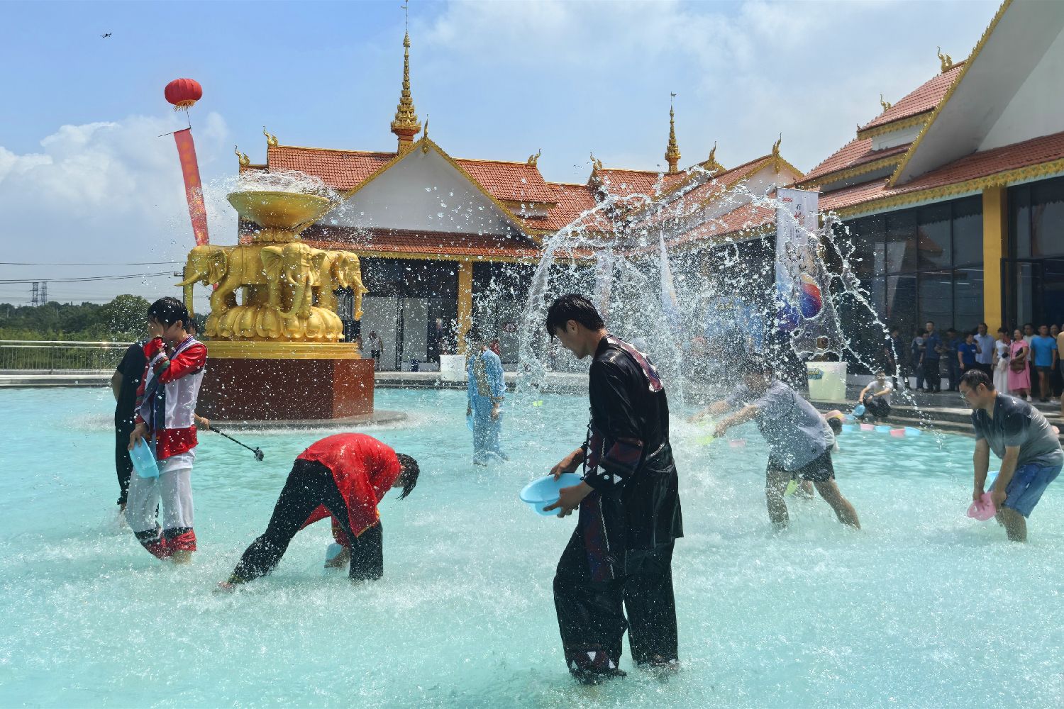 泼水狂欢派对将活动推向高潮。在音乐的节奏中,各族村民与游客拿起水盆涌入泼水区,进行泼水“大战”。身穿傣族服饰的游客吴斓笑着说,洋林村新建的泼水广场,非常具有傣族风情。“傣族文化中,泼水代表传递祝福,希望把吉祥带给每个人。”