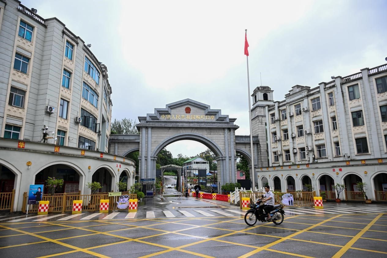 一辆摩托车从云南省德宏傣族景颇族自治州瑞丽市畹町口岸前驶过。
