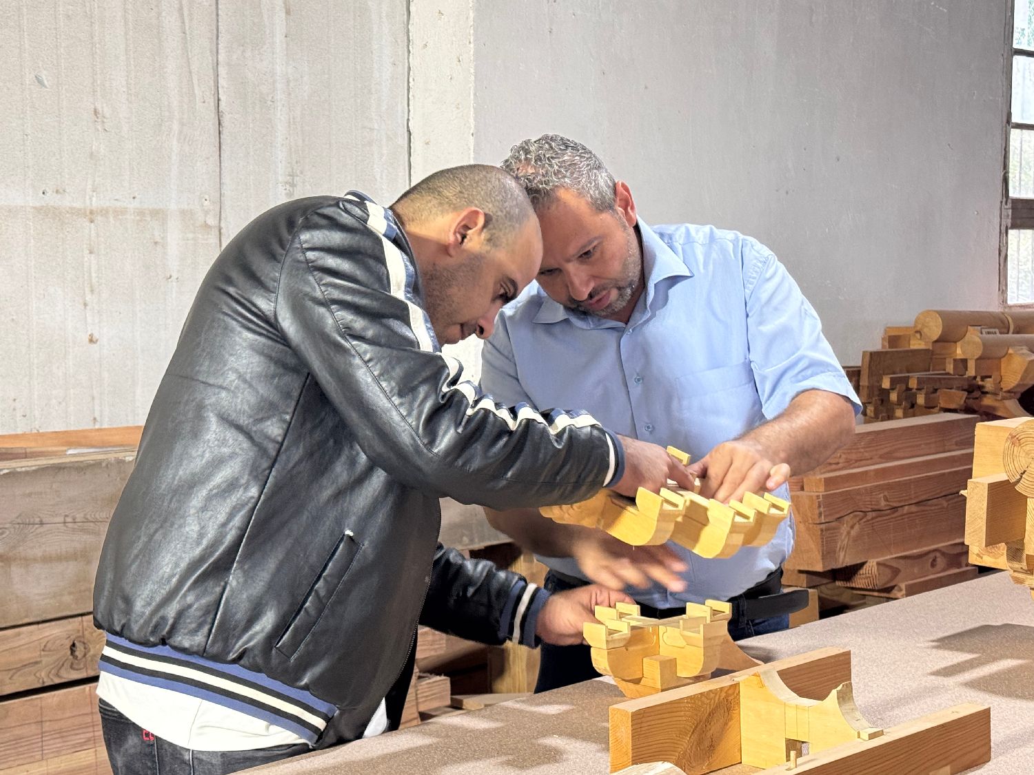 9月10日,来自约旦的奥斯(左)在关中木构古建营造技艺工坊内与同行交流。(图片来源:中新社)