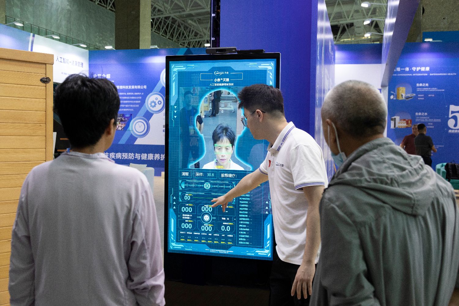 在人工智能健康筛查系统前站立90秒后,包含机体年龄、心率、血压等在内的多项指标一键生成。系统显示,65岁的李女士健康状态综合评分为85分,总体良好但存在高血压风险。这让李女士感到惊奇:“我确实有高血压,没想到测得这么准。”