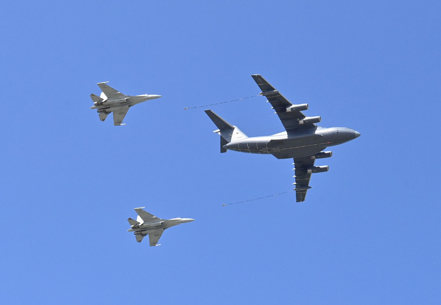 9月16日,吉林长春,2025空军航空开放活动和长春航空展在长春国际航空博览城进行预演。图为运油-20A(右一)与歼-16双机编队通场。(图片来源:中新社)