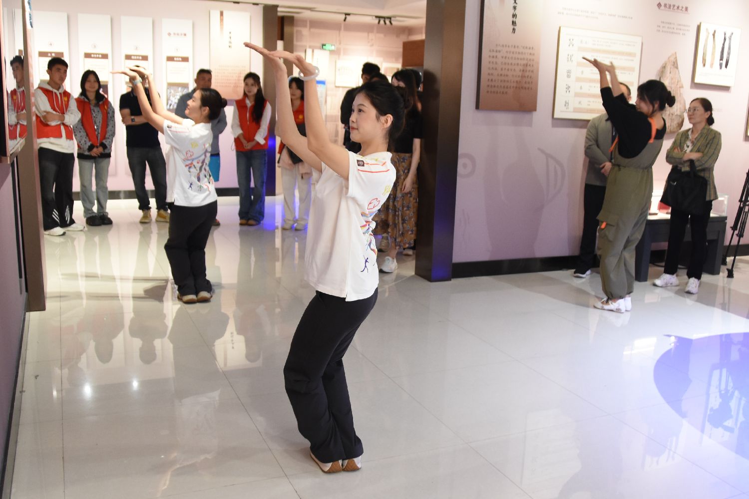 9月20日,近20名台湾青年在河南安阳师范学院开展“字启文明・文脉永续”甲骨文文化体验活动。图为台湾青年体验甲骨文体操。(图片来源:中新社)
