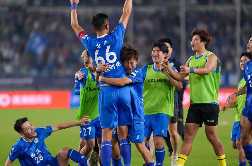 10月4日,南京队球员赛后拥抱庆祝胜利。(图片来源:新华社)