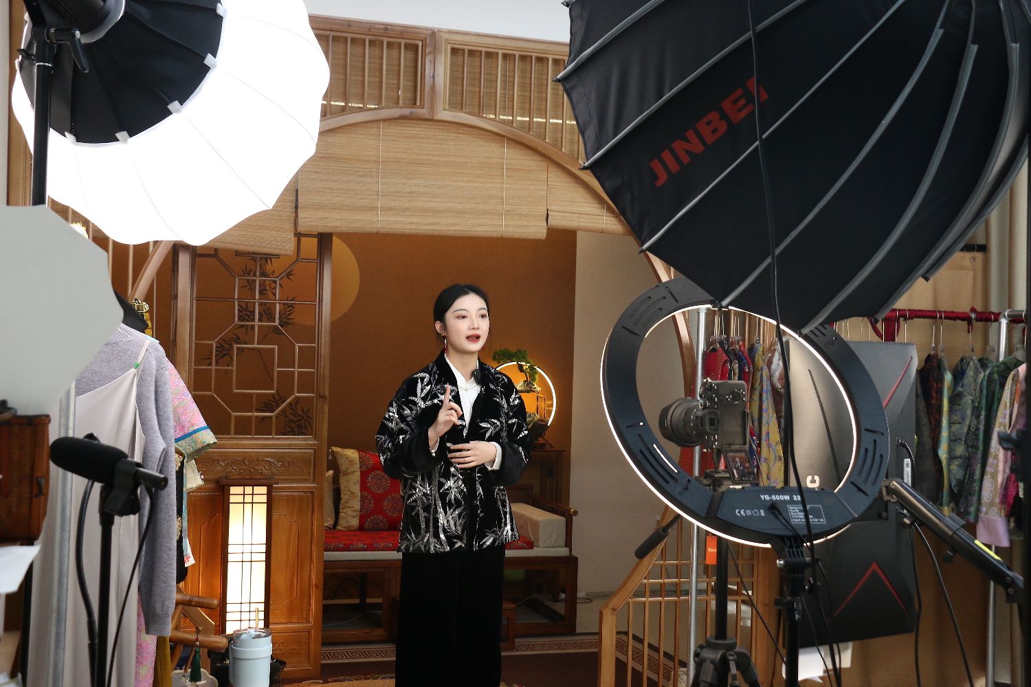 图为主播身穿中国国风服饰带货。(图片来源:中新社资料图)