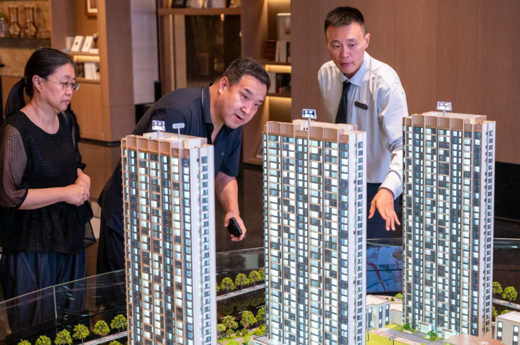图为9月7日,山西太原一房地产置业顾问为客户介绍商品房户型。(图片来源:中新社)