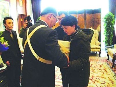 2010年12月9日,刘添财(左)将朱枫烈士骨灰交给其后人。(图片来源:中新社)