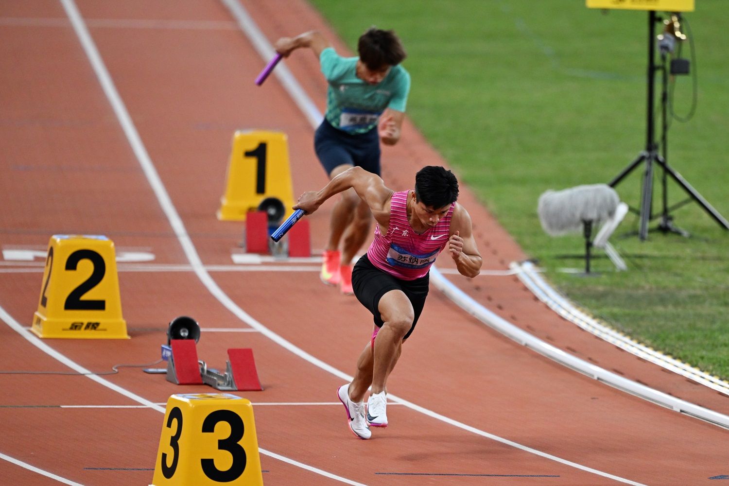 苏炳添20日在全运会男子4×100米接力决赛的跑道上。(图片来源:中新社)