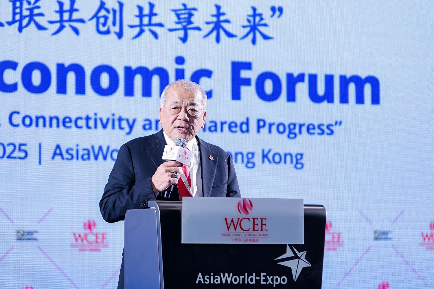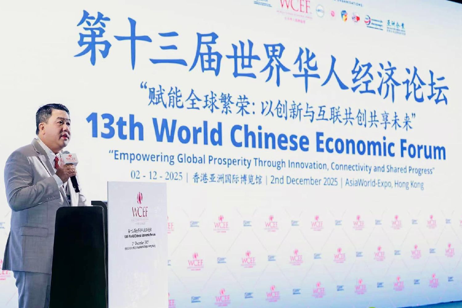 12月2日,第十三届世界华人经济论坛在香港亚洲国际博览馆举办。图为世界华人经济论坛主席谢泉勇致辞。(图片来源:中新社/主办方供图)