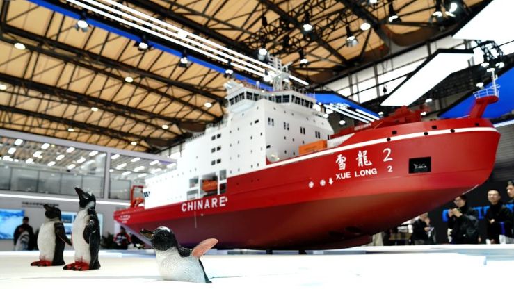 中国国际海事会展上展出的“雪龙2”号极地科考破冰船模型。(图片来源:新华社)