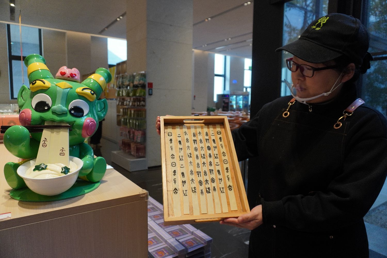 12月9日,河南安阳,殷墟博物馆子飨餐厅工作人员展示“甲骨文面条”。(图片来源:中新社)