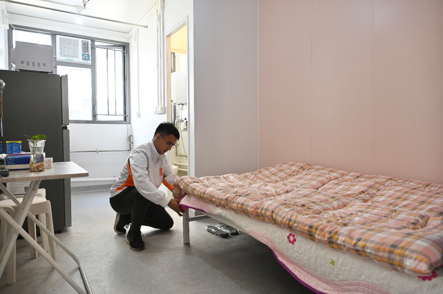 12月12日,过渡性房屋项目“七星荟”项目主任庞学旻在位于香港元朗的“七星荟”过渡性房屋内整理设施。(图片来源:中新社)